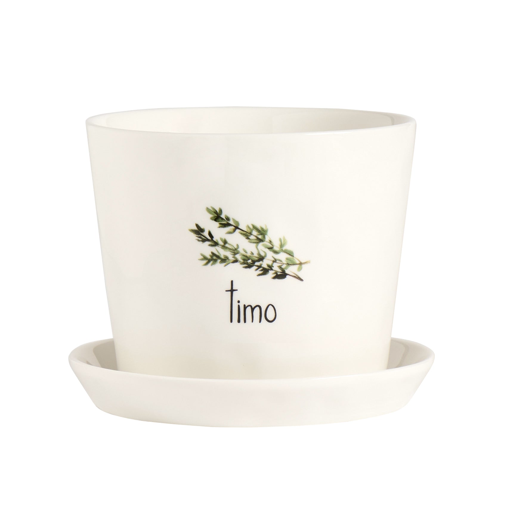 Vaso bianco in gres porcellanato decoro Timo, con sottovaso